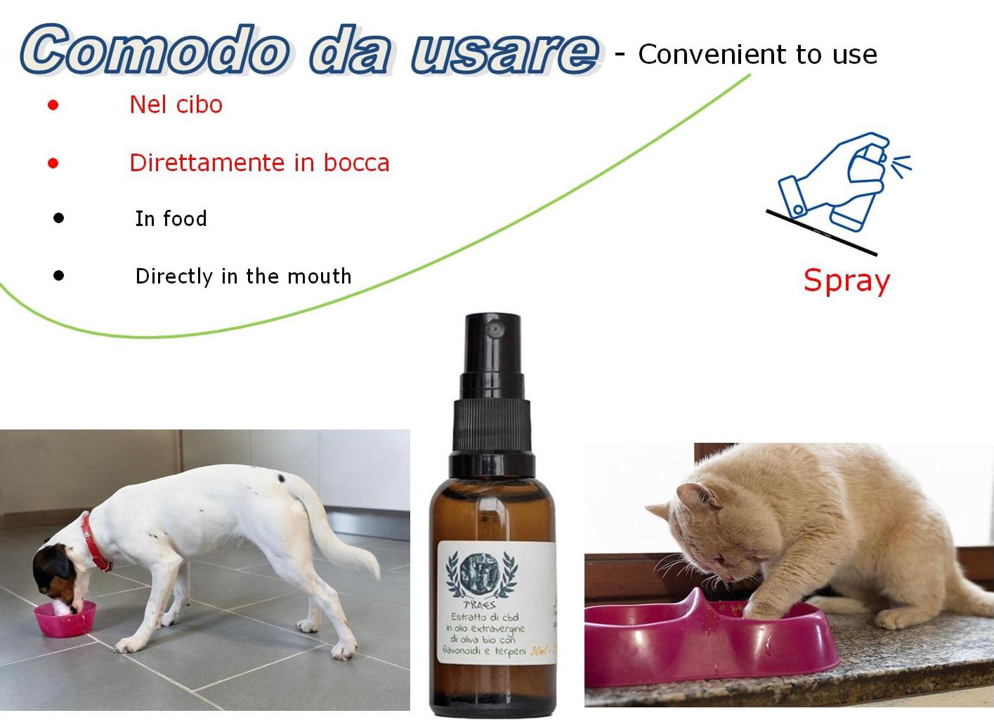 E’ facile da applicare grazie al suo paratico flacone spray direttamente in bocca o nel cibo del tuo cane o del gatto. Massima qualità e purezza con flavonoidi e terpeni, ricco di vitamina B-A-E con amminoacidi omega 3 e omega 6.